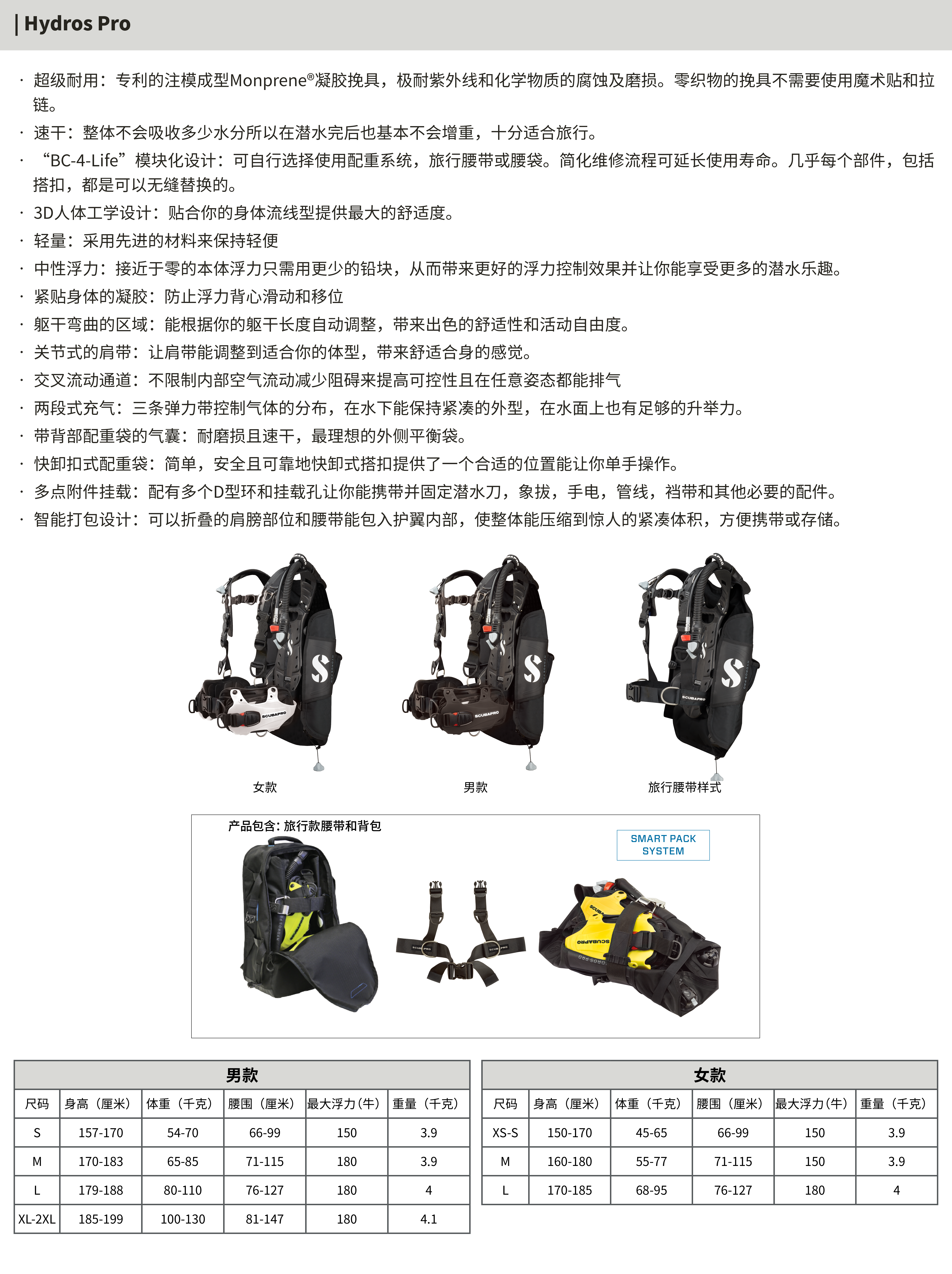 一件真正的突破性产品,是SCUBAPRO工程技术的卓越结晶。模块化结构和Monprene®材质的应用,赋予了Hydros Pro深厚的潜力和舒适稳定性,丰富的卡扣接口支持众多组件,方便用户自行定制来让自己BCD用起来得心应手。其可更换的旅行腰带,打包式设计和一个足够容纳你全套潜水器材的背包,让你能带着Hydros Pro轻松地去各地旅行和潜水。