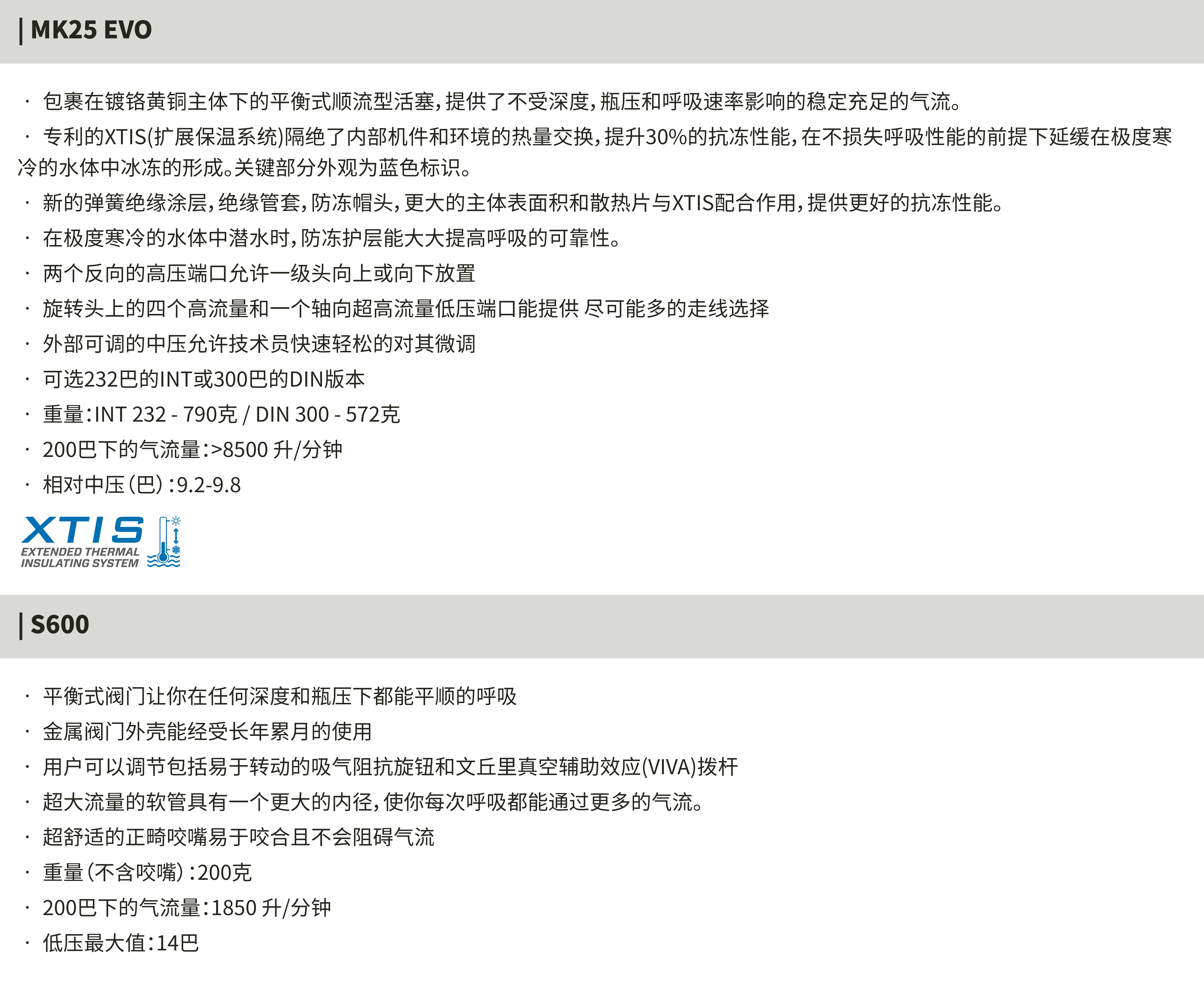 MK25 EVO有着出色的抗冻性能,精湛的吸气灵敏度和顺畅充足的气流。S600采用了坚固的玻璃纤维外壳和不锈钢前盖和环套,无论何种深度都能提供稳定而高效的气流。在任何水温和严苛的潜水环境,这套系统都表现出色。